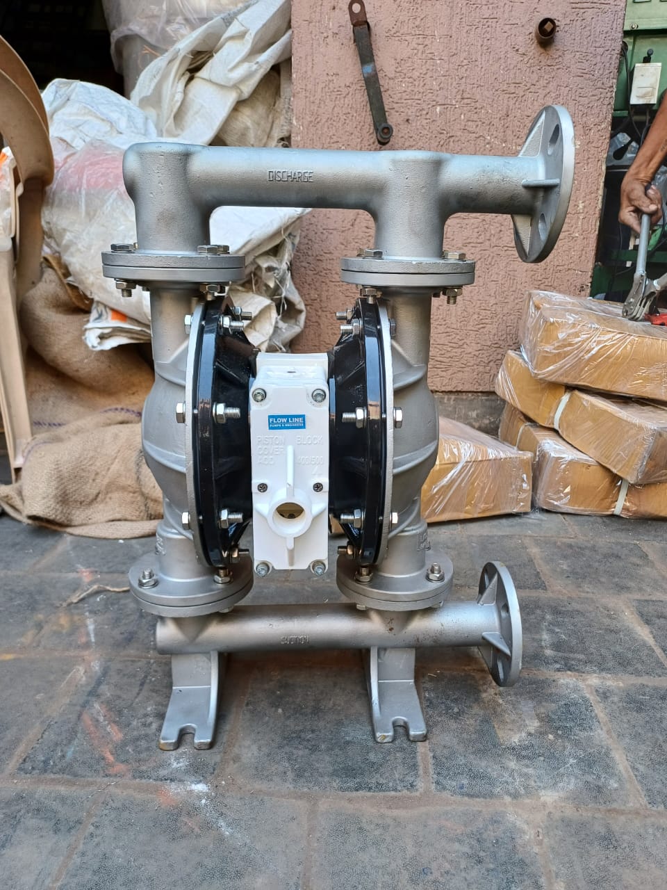 Air Operated Double Diaphragm Pump-AODD Series Air-operated double diaphragm pumps (AODD pumps) are designed for fluid transfer in a variety of Industrial applications. AODD diaphragm pumps reliably convey a wide range of fluids, viscous media, corrosive fluids and solids. AODD Series offers diaphragm pumps in different materials (metallic, non-metallic) and drive principles (electric, pneumatic) to meet the needs of Customer application. AODD pumps are not only the most cost effective, reliable and energy efficient solution, but our advanced air distribution system dramatically increases pump productivity by reducing air consumption and maintenance of most energy. The ideal solution for increasing your productivity, reducing energy consumption, reducing air consumption and simplifying maintenance. Flow line Pumps of the leading manufacturers of Pneumatic diaphragm pumps, we offer a full line of AODD pumps in a variety of sizes and flow rates to meet the versatility and flexibility you need to make pumping simple. Pump body materials Polypropylene(PP) Polyvinylidene Fluoride(PVDF) Aluminum Stainless Steel-316 Diaphragm materials  Teflon(PTFE)  Sentropene  Fluorine Rubber  Polyurethane  Buna-N Rubber Operating Data: Air Pressure : 8.6Kg/cm2 Head : Up to 45 Mtr Capacity : 850 LPM Drive : Air Compressor /Electrical Motor Connection : Threaded/Flange/TC Max Handling temp : 100 Degree MOC : PP/PVDF/Aluminium/SS-316 Features : AODD diaphragm pumps offer many unique advantages in a variety of applications, including:  Self-priming  Shear sensitive  High suction range  Variable flow and pressure  Viscous and non-viscous product transfer  Easy to operate and maintain  Corrosion resistant  No heat generation Application: Transfer peanut butter, pickles, mashed potatoes, small red sausages, jam, applesauce, chocolate, etc. Transfer Pumping paint, gum, pigment , Adhesives and glues, all kinds of available pump suction, Various abrasives, corrosives, petroleum and mud, cleaning oil scale and general containers.
